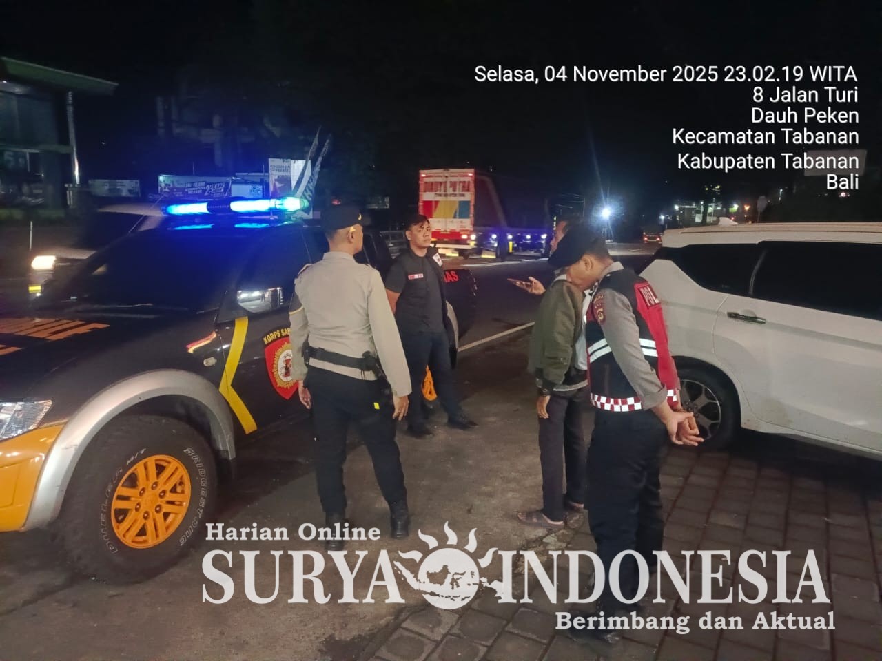 Tabanan, Surya indonesia.net – Untuk memastikan keamanan dan ketertiban masyarakat di malam hari, Polres Tabanan melalui gabungan piket fungsi melaksanakan kegiatan Patroli Pamapta di wilayah hukum Polres Tabanan, Selasa malam (04/11/2025). Kegiatan ini dipimpin langsung oleh Pamapta II, IPDA I Wayan Wisnu Pradana, S.H., bersama personel Piket Samapta dan Piket Intelkam. Patroli berlangsung mulai pukul 22.30 Wita hingga 23.30 Wita.