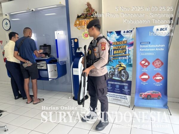 Tabanan, Surya indonesia.net –  Guna memastikan keamanan aktivitas perbankan dan memberikan rasa aman kepada masyarakat, Sat Pamobvit Polres Tabanan bersama personel Sat Samapta melaksanakan giat pengamanan (jaga bank) di sejumlah kantor bank yang berada di wilayah Kabupaten Tabanan, Selasa (04/11/2025). Kegiatan ini merupakan tindak lanjut dari Sprin Kapolres Tabanan No: Sprin/1798/IX/PAM.3./2025 tanggal 24 Oktober 2025, dan berlangsung sejak pukul 08.00 hingga 17.00 Wita.