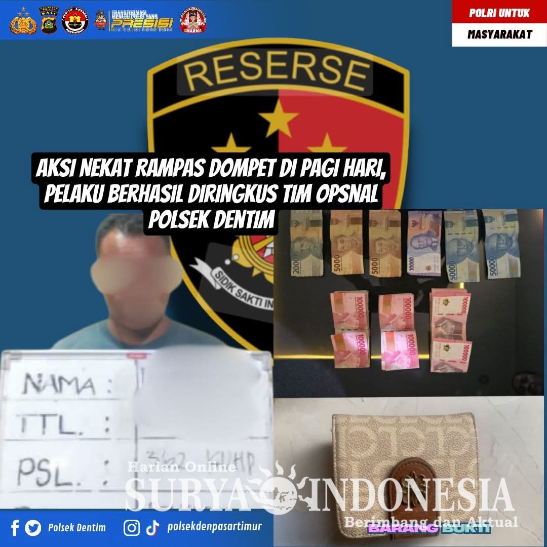 Denpasar , Surya indonesia.net – Aksi nekat seorang pria yang merampas dompet milik warga di kawasan Jalan Trengguli, Kelurahan Penatih, Denpasar Timur, akhirnya berakhir di tangan aparat Kepolisian. Tim Opsnal Polsek Denpasar Timur (Dentim) berhasil mengamankan pelaku berinisial INS (41thn), warga Jalan Seroja, Denpasar, setelah melakukan penyelidikan cepat berdasarkan laporan masyarakat.
