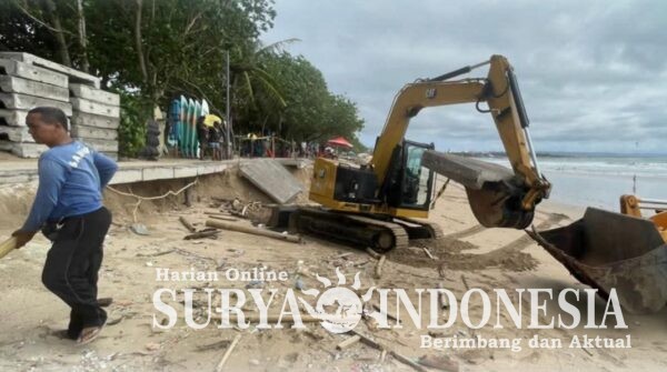 Badung , Surya indonesia.net – Pedestrian di sepanjang Pantai Kuta, Kecamatan Kuta, Badung, mengalami kerusakan cukup parah setelah dihantam gelombang tinggi akibat pasang air laut (rob) pada Kamis (6/11) malam. Kondisi ini langsung direspons oleh Dinas Pekerjaan Umum dan Penataan Ruang (PUPR) Kabupaten Badung dengan menurunkan alat berat untuk melakukan perapian sementara di sejumlah titik yang terdampak pada Jumat (7/11) pagi.