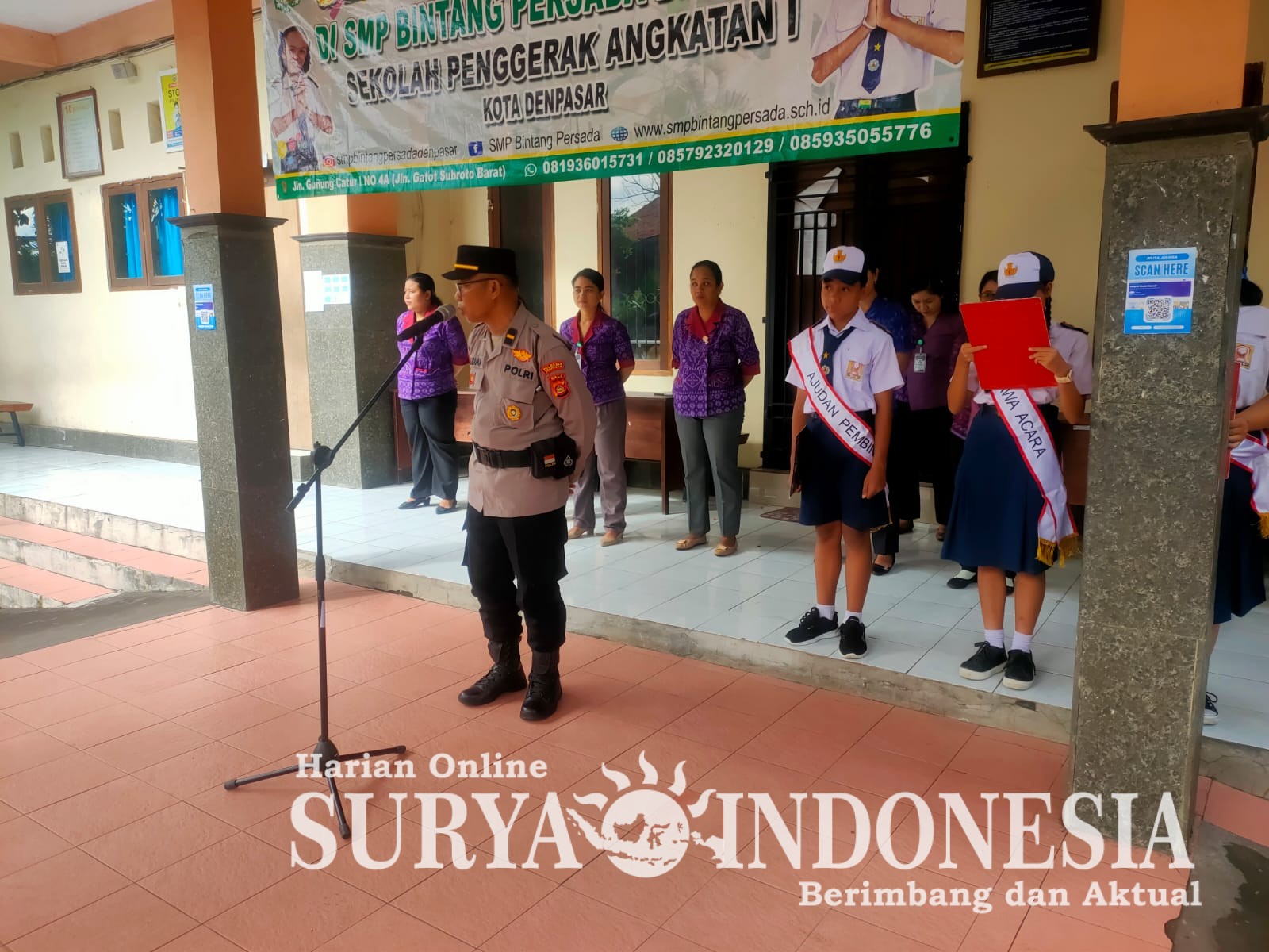 Denpasar, Surya indonesia.net – Panit Binmas Polsek Denpasar Barat (Denbar) Ipda Wayan Sudima bertindak sebagai Pembina Upacara di SMP – SMK Bintang Persada Denpasar pada Senin (tanggal). Kegiatan tersebut merupakan bagian dari upaya pembinaan dan edukasi kepada para pelajar terkait kedisiplinan serta pentingnya menjaga lingkungan sekolah yang aman dan kondusif.