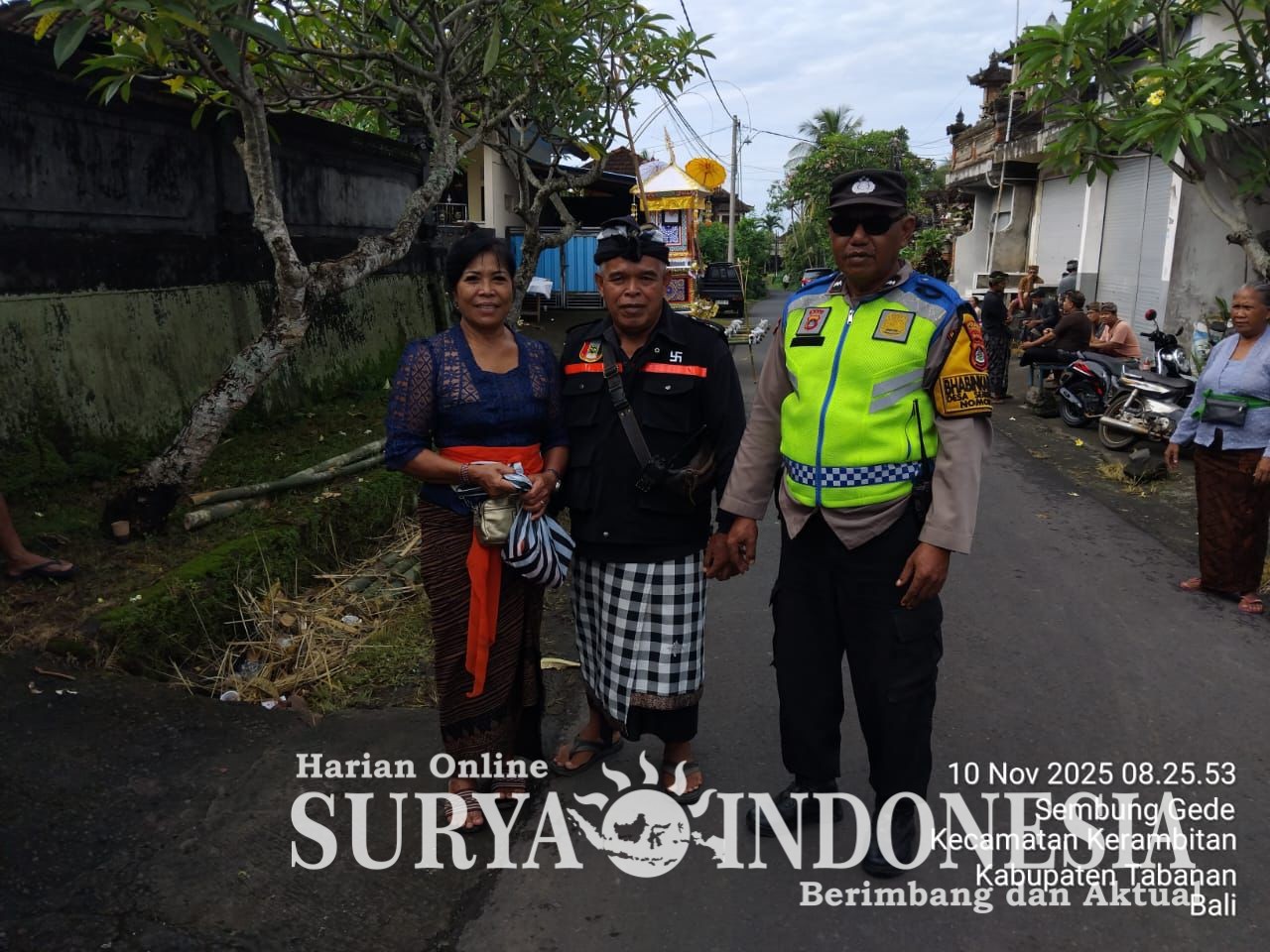 Tabanan, Surya indonesia.net – Polsek Kerambitan, Senin 10 November 2025 ; Bhabinkamtibmas Desa Sembung Gede Aipda I Gusti Komang Karyawan bersama  Pecalang Desa Adat Sembung Gede melaksanakan pengamanan kegiatan Ngaben di Banjar Sembung Gede, Desa Sembung Gede.