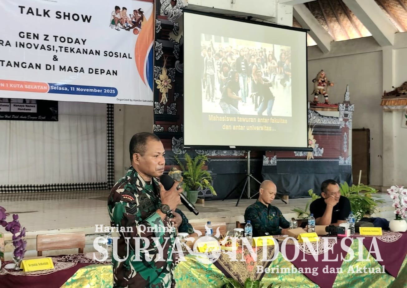 BALI – Badung,Surya indonesia.net –  Batih Tuud Koramil 1611-08/Kuta Selatan, Serka Dominggus Mai Sila, menjadi narasumber dalam acara Talk Show bertajuk “Gen Z Today: Antara Inovasi, Tekanan Sosial, dan Tantangan di Masa Depan” di Aula SMPN 1 Kuta Selatan, Jl. Wanagiri, Kelurahan Jimbaran. Acara ini bertujuan untuk mengedukasi dan memberikan wawasan kepada siswa-siswi mengenai tantangan yang dihadapi oleh Generasi Z. Rabu, (12/11/25).