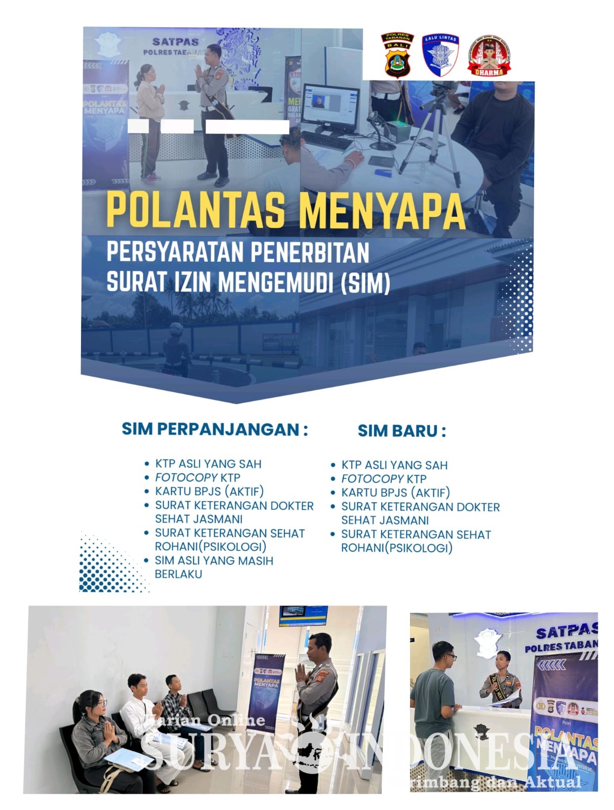 Tabanan, Surya indonesia.net – Satuan Lalu Lintas Polres Tabanan kembali menghadirkan program “Polantas Menyapa”, sebuah inovasi edukatif melalui media sosial yang bertujuan untuk meningkatkan pemahaman masyarakat terkait pelayanan lalu lintas, khususnya mengenai tata cara dan persyaratan pembuatan serta perpanjangan Surat Izin Mengemudi (SIM). Kegiatan ini merupakan wujud nyata komitmen Polres Tabanan dalam memberikan pelayanan yang Presisi, Humanis, dan Profesional.