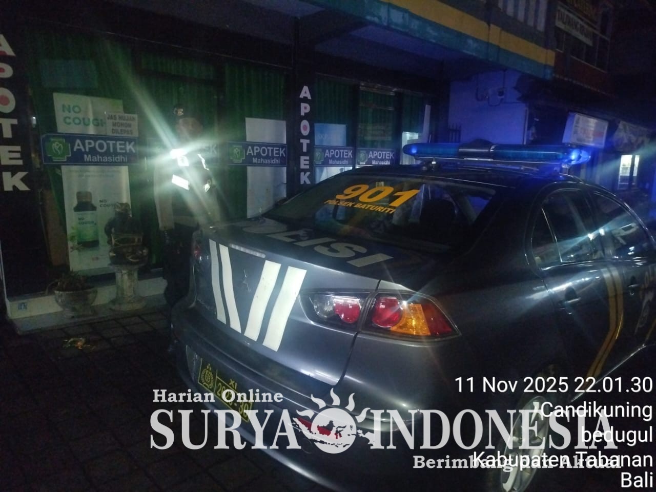 Dalam rangka menjaga situasi keamanan dan ketertiban masyarakat (kamtibmas) di wilayah hukumnya, Polsek Baturiti kembali melaksanakan kegiatan patroli malam pada Selasa (11/11/2025) mulai pukul 22.00 Wita hingga selesai. Patroli tersebut dipimpin langsung oleh Kanit Samapta IPTU I KETUT DARMAWAN bersama AIPDA I KETUT SANDIASA, dengan menggunakan satu unit kendaraan roda empat (R4).