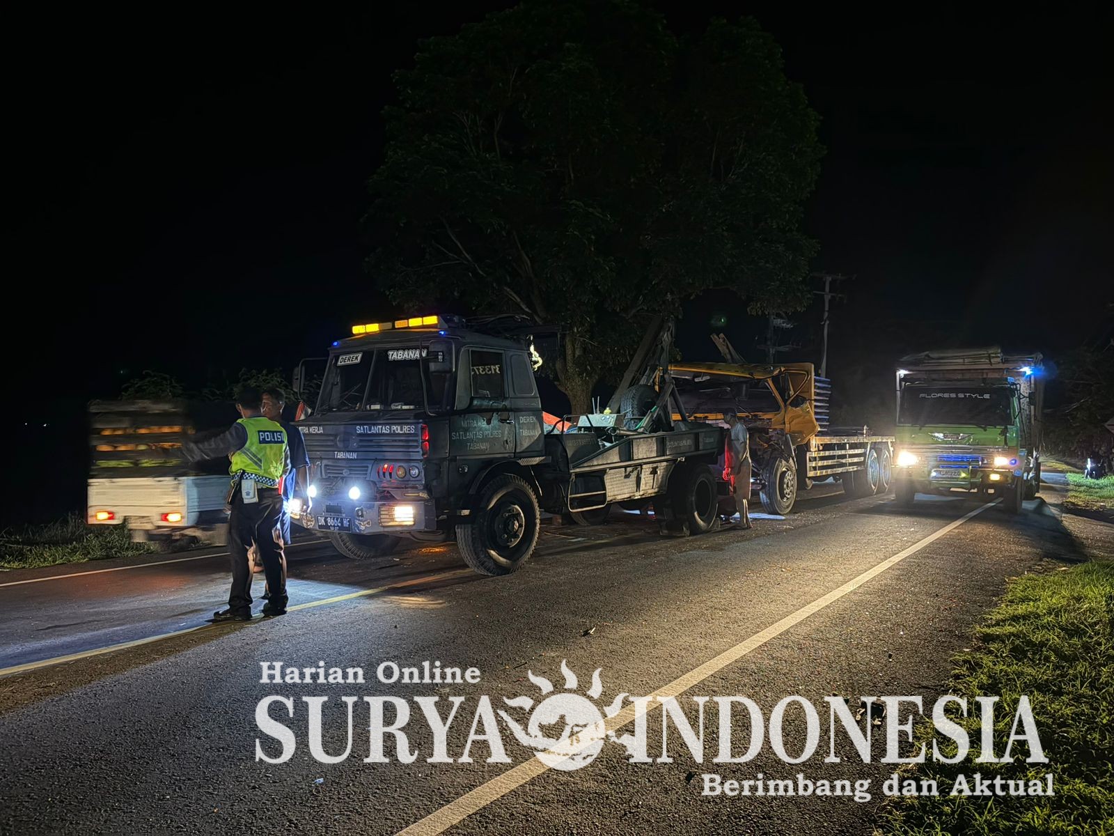 Tabanan, Surya indonesia.net  – Polsek Selemadeg, Sebuah kecelakaan lalu lintas melibatkan dua unit truk tronton terjadi di Jalan Nasional Denpasar-Gilimanuk, tepatnya di depan Gardu Induk Soka, Tabanan, Bali, pada Selasa (11/11/2025) sekitar pukul 20.15 WITA. Truk tronton bernomor polisi L 8042 UBA yang dikemudikan oleh Mochamma Irfan (33) menabrak bagian belakang truk tronton DK 8081 WT yang dikendarai I Putu Siudiartama (48), yang kala itu melakukan pengereman mendadak karena ada kendaraan lain di depannya berhenti.