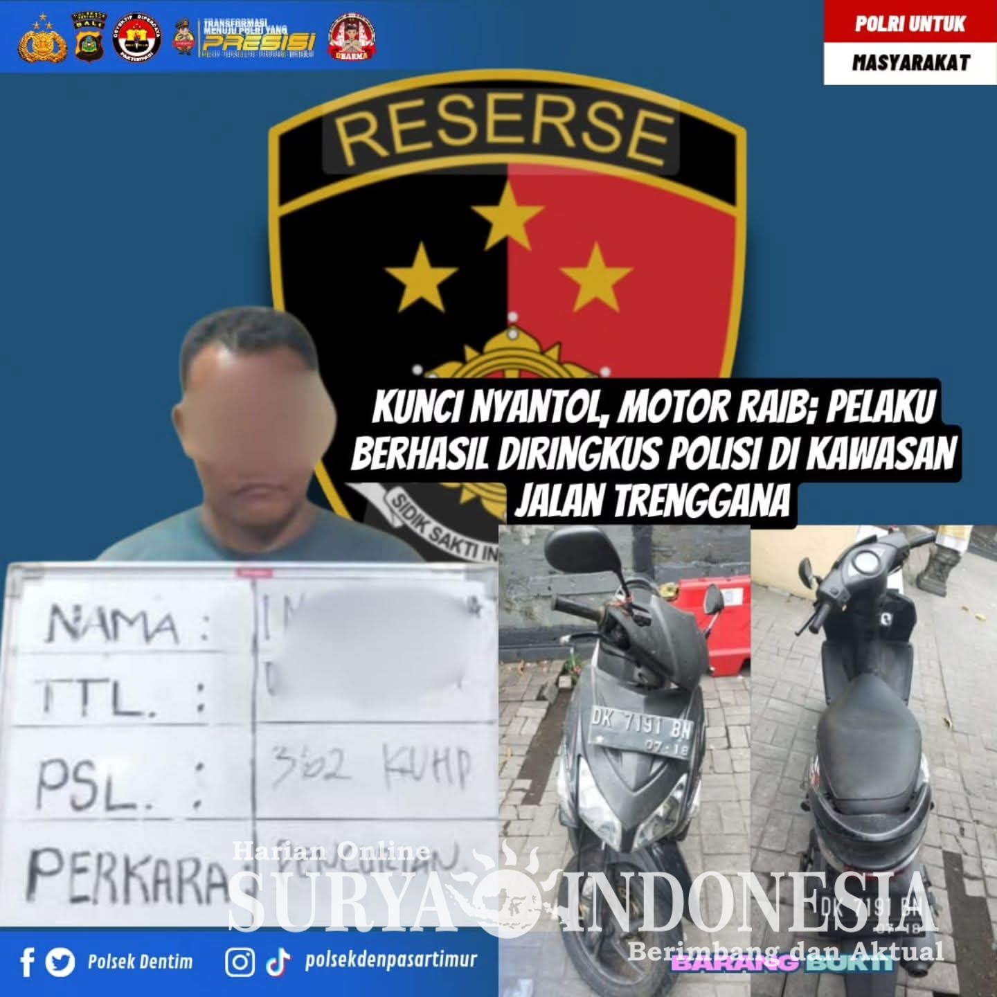 Pelaku berinisial INS (41th), warga Jalan Seroja, Denpasar Timur, diamankan Tim opsnal yang dipimpin Iptu I Nyoman Agus Putra Ardiana, S.H.,M.H., didampingi Iptu I Nyoman Padu di kawasan Jalan Trenggana, Denpasar Timur, berikut barang bukti sepeda motor hasil curian.