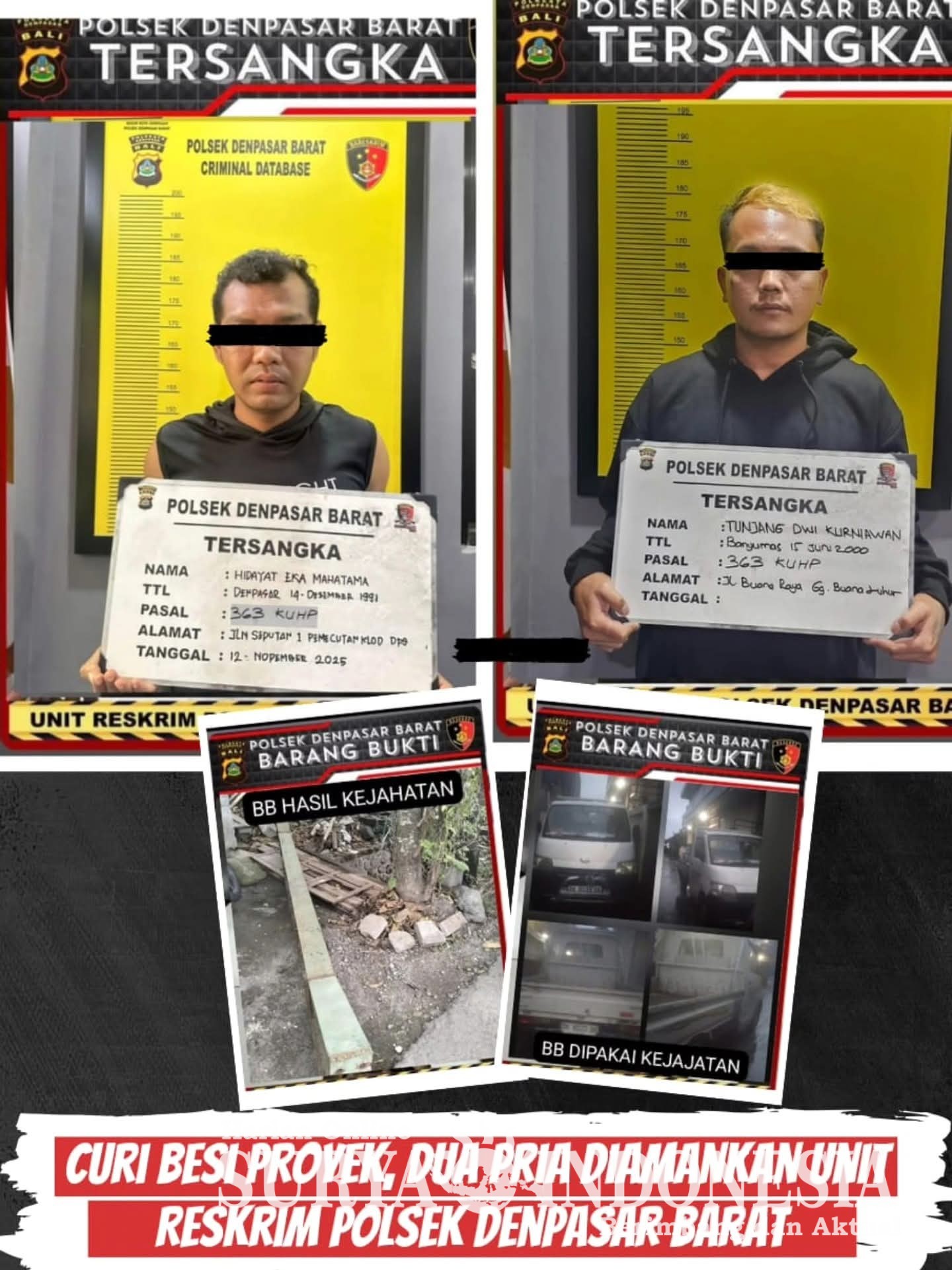Menindaklanjuti laporan tersebut, Tim Opsnal Reskrim Polsek Denpasar Barat yang dipimpin Panit Opsnal IPDA I Made Wicaksana, S.H. segera bergerak melakukan pengecekan lokasi kejadian dan memeriksa saksi-saksi. Petugas mengamankan dua tersangka,