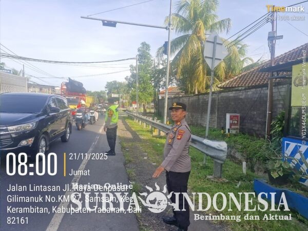 Tabanan, Surya Indonesia.net – Polsek Kerambitan, Jumat 21 November 2025; Anggota Polsek Kerambitan melaksanakan pengawasan, pemantauan dan pengaturan arus lalulintas dalam upaya menciptakan situasi arus lalu-lintas tetap lancar, aman dan kondusif.