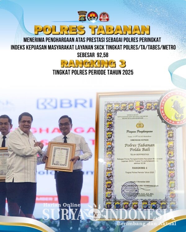 Tabanan, Surya Indonesia.net – Polres Tabanan kembali menorehkan prestasi membanggakan di tingkat nasional. Bertempat di Hotel Grand Said Jaya, Jakarta Pusat, Polres Tabanan resmi menerima penghargaan sebagai Peringkat 3 Nasional dalam Indeks Kepuasan Masyarakat (IKM) Layanan SKCK Tahun 2025. Penghargaan ini diberikan oleh Badan Intelijen Keamanan (Baintelkam) Polri bekerja sama dengan Universitas Syiah Kuala Banda Aceh sebagai pihak independen pelaksana survei. Dengan nilai IKM sebesar 92,58, Polres Tabanan dinilai berhasil memberikan pelayanan prima kepada masyarakat.