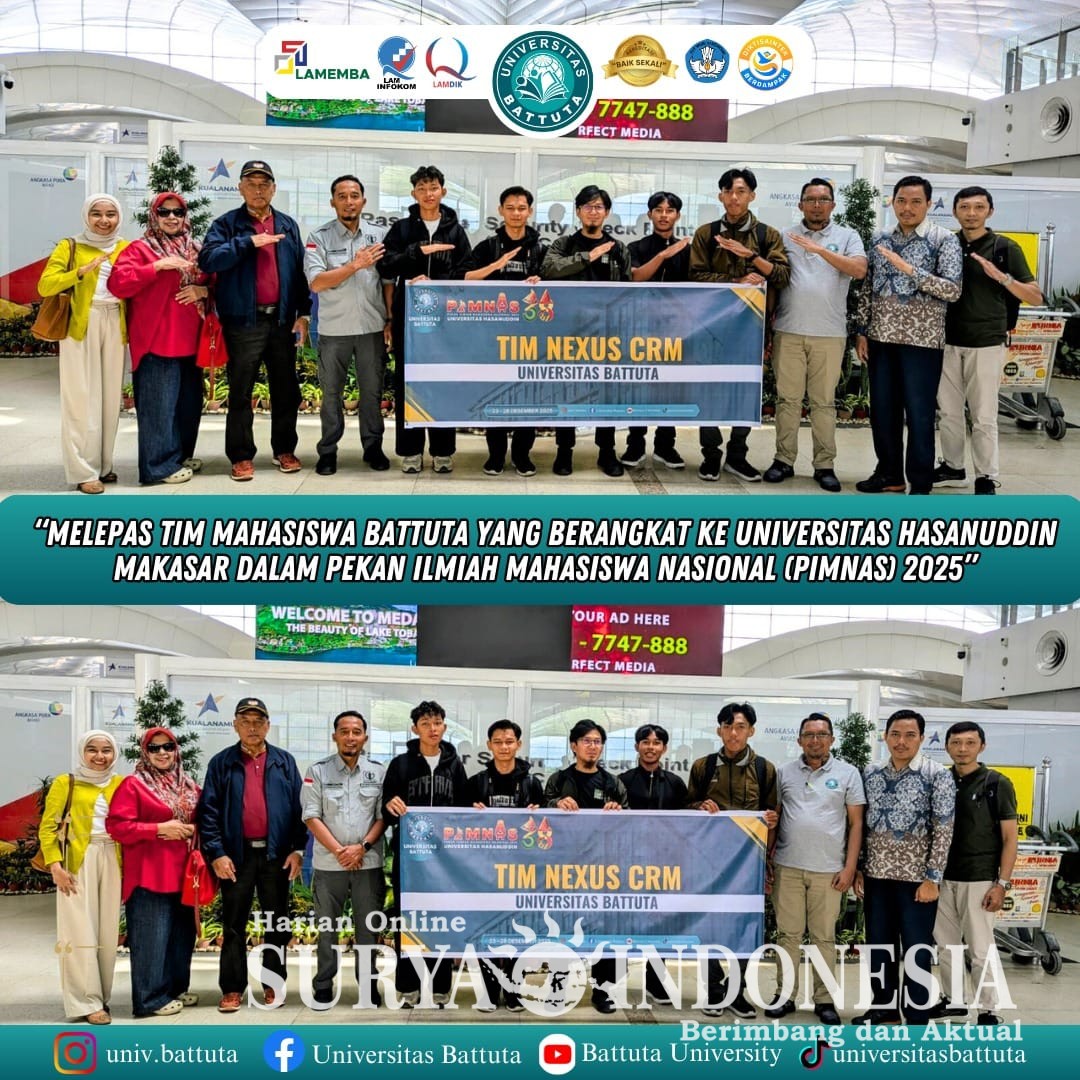 SUMATRA UTARA | SURYA INDONESIA || – Ketua Pengurus Yayasan dan Rektorat Universitas Battuta melepas Tim Mahasiswa dan Dosen Pembimbing Universitas Battuta (@pkmpi.nexuscrm ) untuk berangkat ke Pekan Ilmiah Mahasiswa Nasional (PIMNAS) tahun 2025 di Universitas Hasanuddin Makassar dan menjadi 1 dari 4 Perguruan Tinggi yang mewakili Sumatera Utara. Selasa, (25/11/2025)
