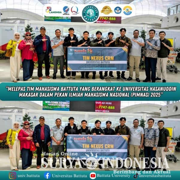 Sumatra Utara, Surya Indonesia.net – Ketua Pengurus Yayasan dan Rektorat Universitas Battuta melepas Tim Mahasiswa dan Dosen Pembimbing Universitas Battuta (@pkmpi.nexuscrm ) untuk berangkat ke Pekan Ilmiah Mahasiswa Nasional (PIMNAS) tahun 2025 di Universitas Hasanuddin Makassar dan menjadi 1 dari 4 Perguruan Tinggi yang mewakili Sumatera Utara