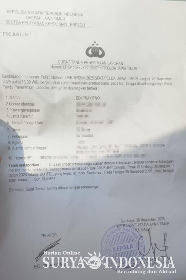 Surabaya, Surya Indonesia.net — Seorang jurnalis profesional, Edi Prayitno, resmi melaporkan dugaan pengancaman melalui media elektronik serta penyebaran sebuah video bermuatan intimidasi ke Polda Jawa Timur pada Selasa, 26 November 2025.