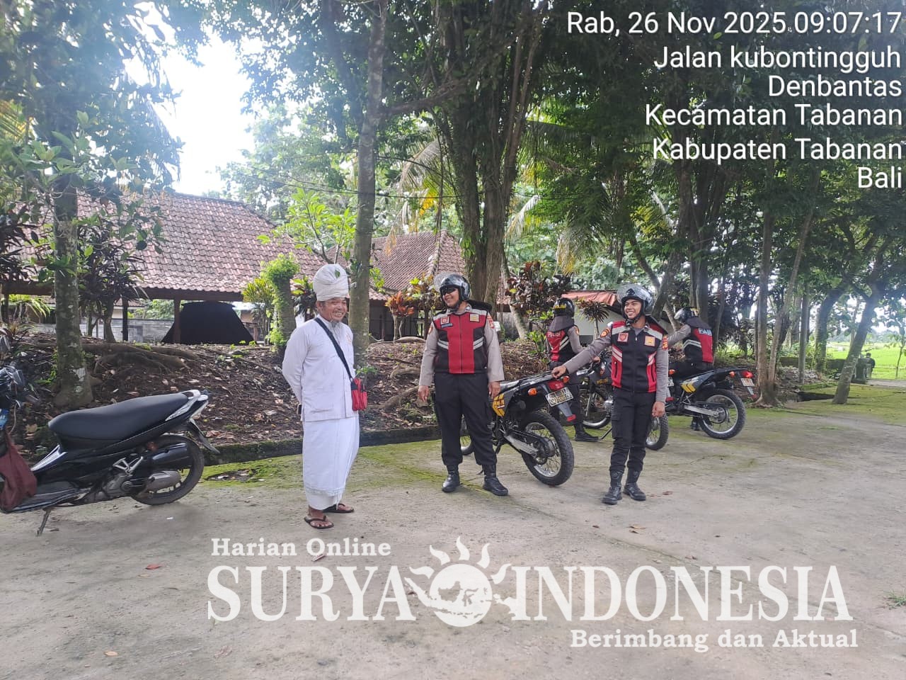 Tabanan, Surya Indonesia.net – Satuan Samapta Polres Tabanan kembali melaksanakan Patroli Dialogis berbasis Lingkungan (Padi Bali) pada Rabu, 26 November 2025, pukul 08.30 hingga 09.30 WITA. Kegiatan ini menyasar empat lokasi berbeda, yaitu Pura Dalem Kubontingguh, Pura Bhwana Kawan, Terminal Tuakilang, dan kawasan Rongsokan Subamia. Patroli ini bertujuan memperkuat hubungan antara kepolisian dan masyarakat serta menciptakan situasi kamtibmas yang aman dan kondusif.