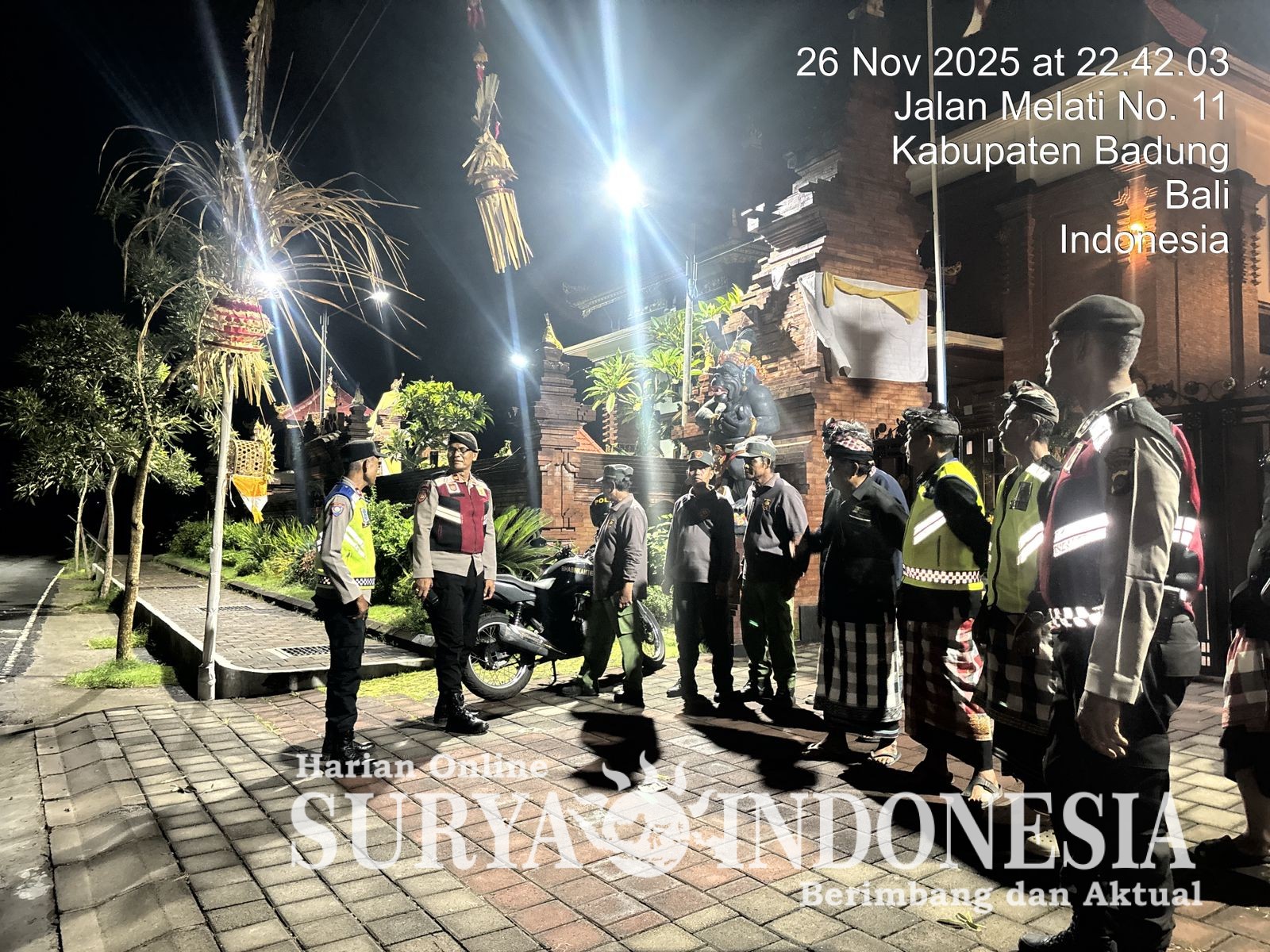 Mengwi, suryaindonesia.net – Dalam rangka mencegah potensi terjadinya pencurian pratima serta memastikan keamanan kawasan pura, Polsek Mengwi melaksanakan patroli atensi wilayah yang bersinergi dengan Linmas, Pecalang, dan Bakamda Desa Gulingan, Kecamatan Mengwi, Kabupaten Badung. Rabu (26/11/2025) malam