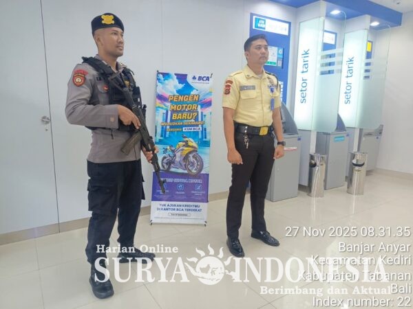 Tabanan, Surya Indonesia.net – Sat Pamobvit Polres Tabanan bersama personel Sat Samapta melaksanakan kegiatan pengamanan dan jaga bank di sejumlah kantor bank yang ada di wilayah Tabanan pada Kamis (27/11/2025) mulai pukul 08.00 hingga 17.00 WITA. Kegiatan ini dilaksanakan berdasarkan Sprin Kapolres Tabanan No: Sprin/1798/IX/PAM.3./2025 tanggal 24 Oktober 2025, sebagai langkah preventif untuk memastikan keamanan dan kenyamanan nasabah dalam melakukan transaksi perbankan. Pengamanan dilakukan di Bank BRI, BPD, BNI, dan BCA yang tersebar di Tabanan, Kediri, Baturiti, hingga Bajera.