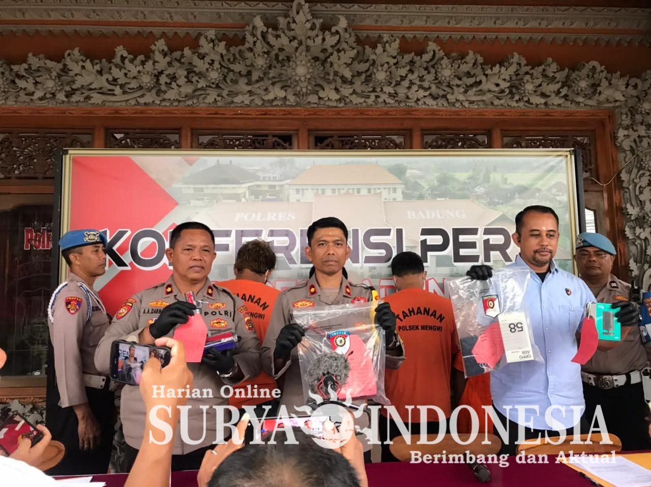 Dalam konferensi pers, Kompol I Gede Suarmawa menyampaikan bahwa terdapat lima laporan polisi dengan lima terduga pelaku yang berhasil diungkap jajaran Polsek Mengwi. “Empat orang terduga pelaku saat ini telah ditahan di Polsek Mengwi, sementara satu lainnya ditahan di Polres Klungkung terkait kasus berbeda. Pengungkapan ini merupakan hasil kerja cepat dan profesional anggota Reskrim Polsek Mengwi,” ujarnya.