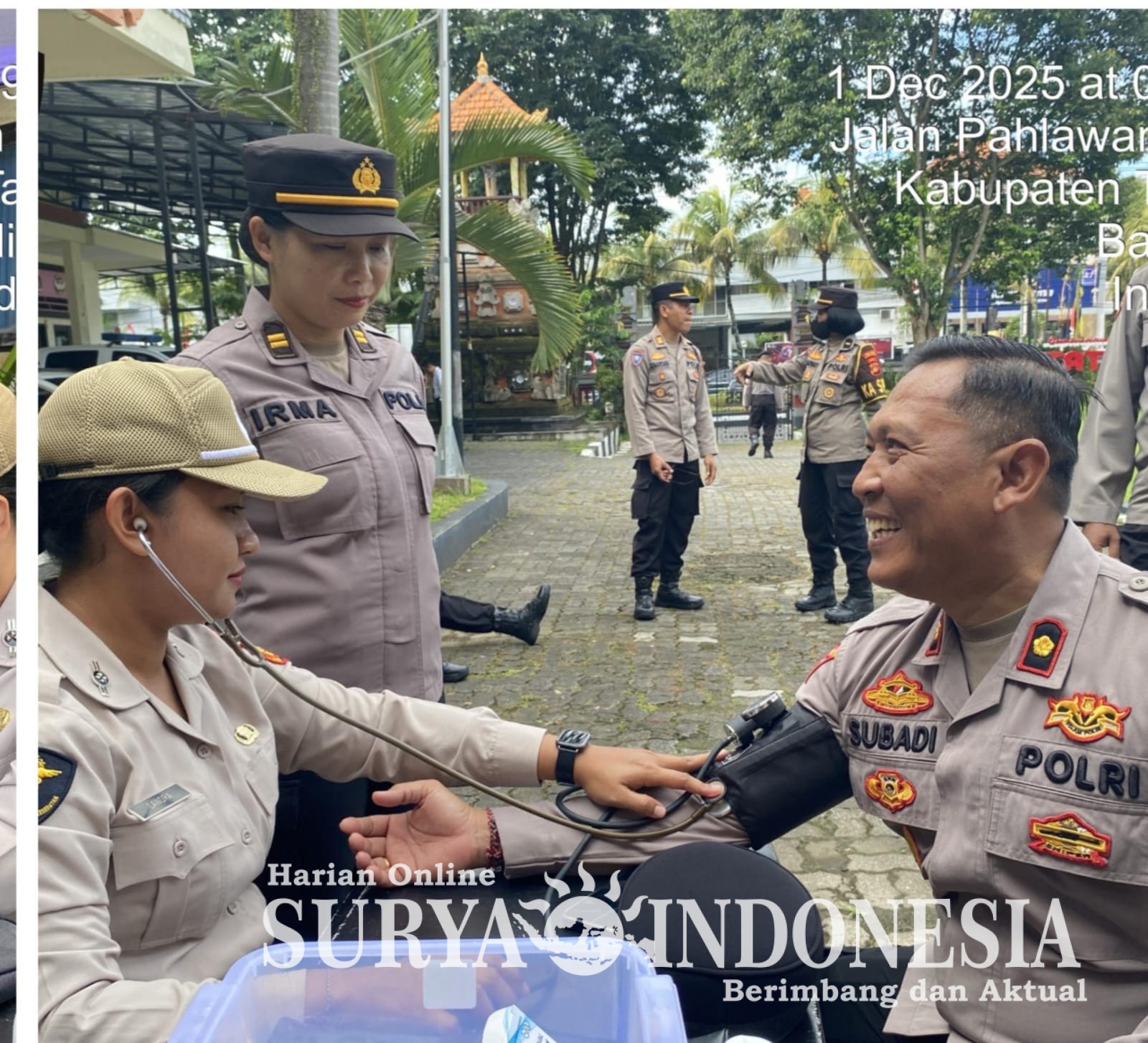 Tabanan, Surya Indonesia.net – Seksi Kedokteran dan Kesehatan (Si Dokkes) Polres Tabanan kembali menunjukkan komitmennya dalam menjaga kesehatan personel melalui kegiatan pemeriksaan kesehatan lapangan yang dilaksanakan pada Senin, 1 Desember 2025. Kegiatan berlangsung di Lapangan Apel Polres Tabanan bertepatan dengan pelaksanaan Apel Jam Pimpinan pukul 08.30 WITA. Dipimpin oleh Kasi Dokkes, IPTU dr. Ni Wayan Irmawati, kegiatan ini melibatkan tiga anggota Sidokkes yang bertugas memberikan layanan kesehatan langsung kepada personel.