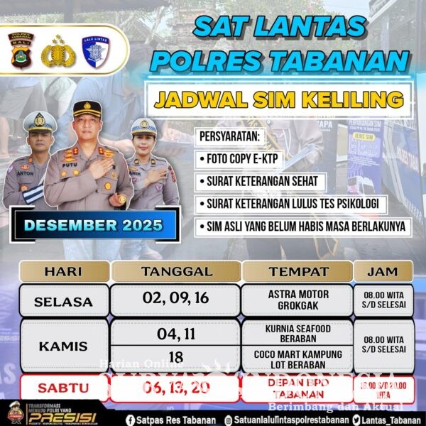 Tabanan, Surya Indonesia.net – Dalam rangka memberikan pelayanan yang mudah dan dekat dengan masyarakat, Sat Lantas Polres Tabanan melalui program “Polantas Menyapa” kembali menghadirkan layanan SIM Keliling. Program ini bertujuan untuk mempermudah masyarakat dalam melakukan perpanjangan SIM tanpa harus datang ke kantor Satpas.