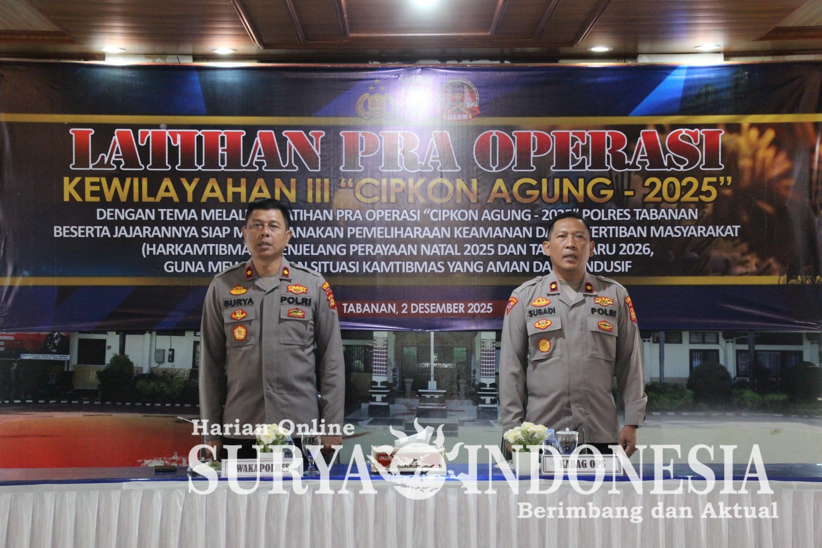 Tabanan, Surya Indonesia.net – Polres Tabanan menggelar Latihan Pra Operasi (Latpra Ops) Kewilayahan III Cipkon Agung 2025 pada Selasa, 2 Desember 2025 bertempat di Aula Wisnu Hartono Polres Tabanan. Kegiatan yang berlangsung pukul 08.00 hingga 10.00 Wita ini mengusung tema kesiapan Polres Tabanan dan jajarannya dalam menjaga keamanan dan ketertiban masyarakat (Harkamtibmas) menjelang perayaan Natal 2025 dan Tahun Baru 2026. Seluruh pejabat operasi serta personel yang tersprint dalam Ops Cipkon Agung 2025 turut hadir dalam kegiatan penting ini.