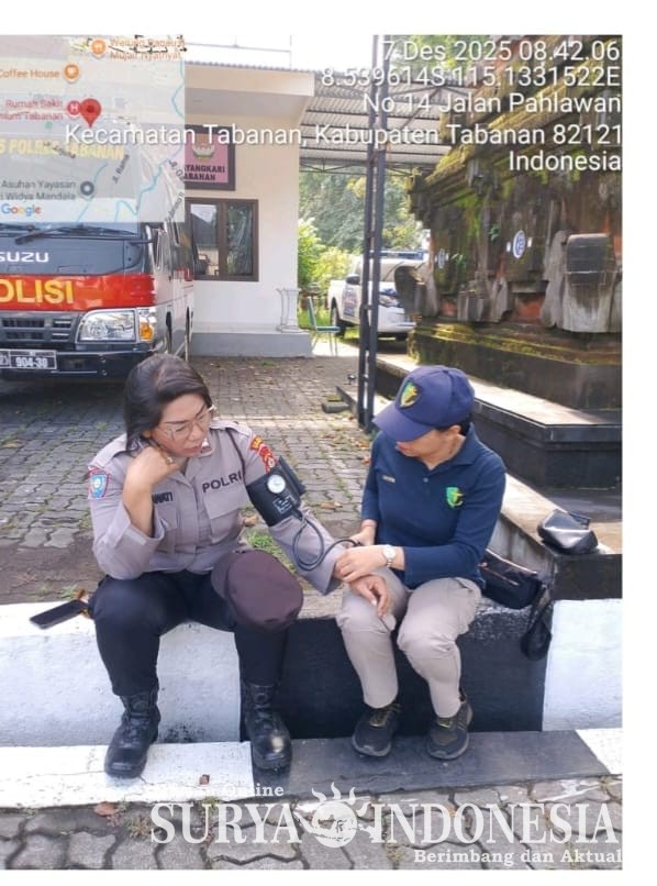 Seijin Kapolres Tabanan AKBP I Putu Bayu Pati, S.I.K., M.H., melalui Kasidokkes Polres Tabanan, IPTU dr. Ni Wayan Irmawati, Dari hasil pemeriksaan terhadap 15 personel, sebanyak 14 personel dinyatakan dalam kondisi normotensi, sementara 1 personel terdeteksi mengalami hipertensi dan telah mendapatkan penanganan awal. Selama kegiatan berlangsung, situasi terpantau aman, tertib, dan kondusif, sebagai wujud komitmen Polres Tabanan dalam menjaga kesiapan dan kesehatan personelnya.