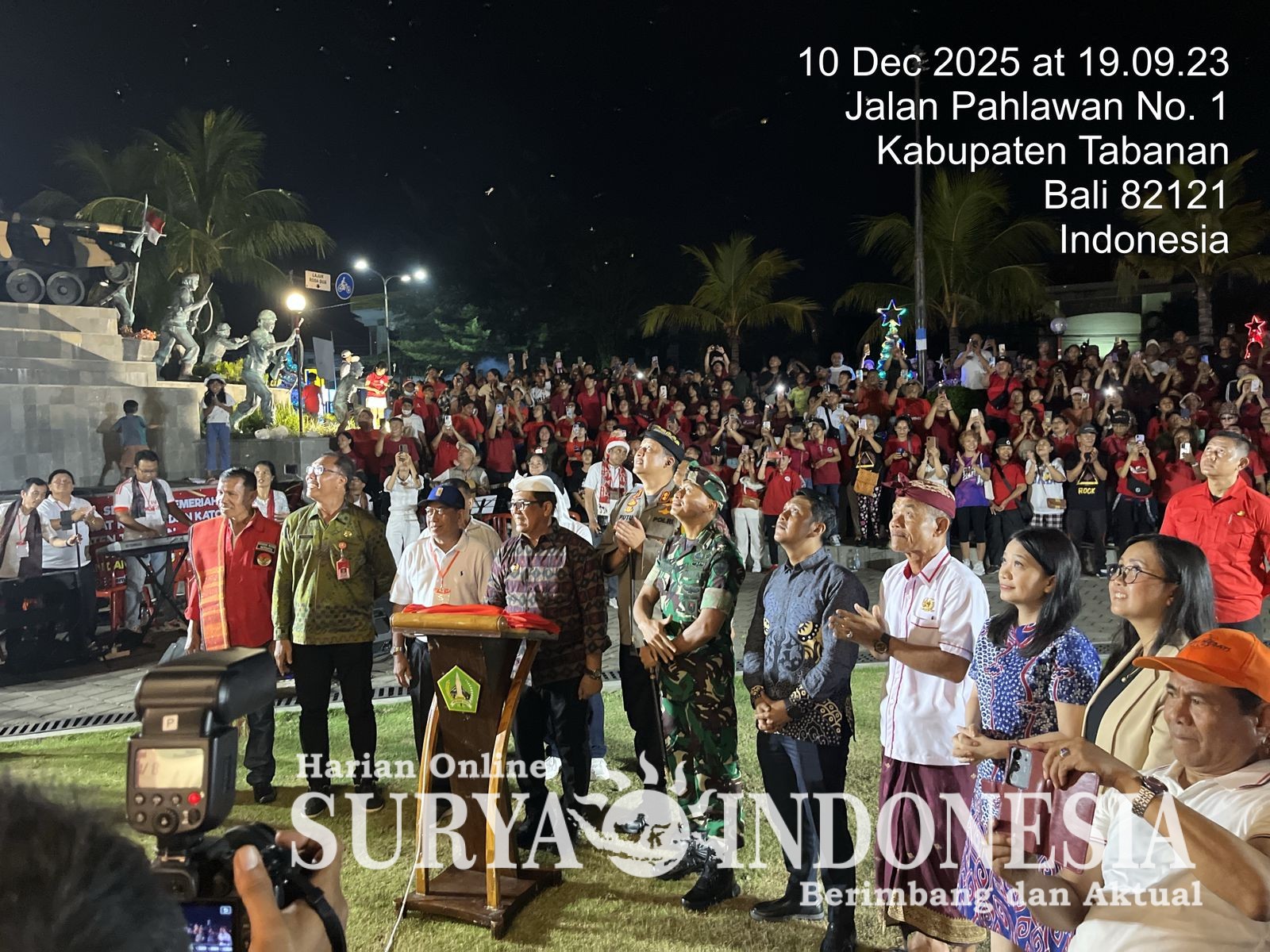 Tabanan, Surya Indonesia.net – Perayaan Umat Kristen dan Katolik Kabupaten Tabanan tahun 2025 berlangsung meriah di Taman Perjuangan Singasana Tabanan pada Rabu (10/12/2025) pukul 16.00–19.00 Wita. Kegiatan ini dihadiri sejumlah pejabat Forkopimda, termasuk Bupati Tabanan Dr. I Komang Gede Sanjaya, Kapolres Tabanan AKBP I Putu Bayu Pati, Dandim 1619 Letkol Inf. Trijuang Danarjati, serta tokoh agama dan masyarakat. Sekitar 500 umat hadir memadati lokasi acara yang mengusung semangat persaudaraan, toleransi, dan kebersamaan antarumat beragama di Kabupaten Tabanan.