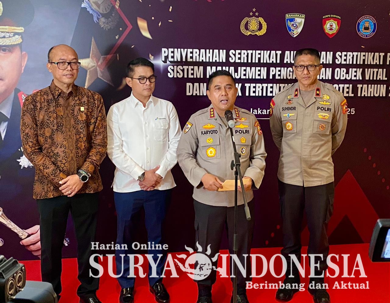 Jakarta, Surya Indonesia.net — Badan Pemelihara Keamanan (Baharkam) Polri secara simbolis menyerahkan Sertifikat Audit Penerapan Sistem Pengamanan Objek Vital Nasional dan Objek Tertentu serta Hotel Tahun 2025. Kegiatan tersebut berlangsung di Gedung Auditorium Lantai 3 PT PLN (Persero), Senin (15/12/2025), sekitar pukul 10.45 WIB.