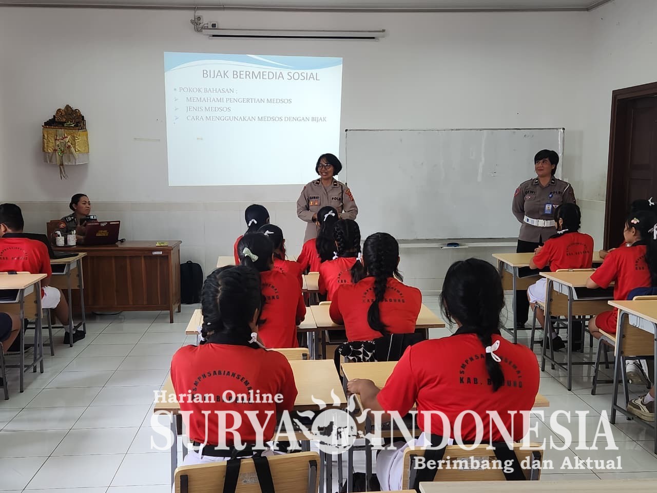 Mangupura, Surya Indonesia.net – Polwan Polres Badung melaksanakan kegiatan edukasi dan sosialisasi pencegahan bullying, bijak menggunakan gadget, serta kekerasan terhadap anak di SMA Negeri 2 Mengwi dan SMP Negeri 5 Abiansemal. Selasa (16/12/25). Kegiatan ini dihadiri oleh jajaran Polres Badung di antaranya Kasat Binmas Polres Badung, Kabag/pejabat SDM Polres Badung, personel Polwan dari fungsi Binmas, PPA, dan Lantas, tenaga medis Polres Badung, pihak sekolah, guru, serta para siswa dan siswi dari kedua sekolah tersebut.