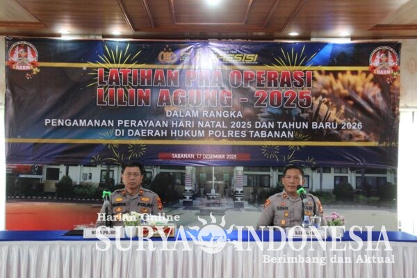 Tabanan, Surya Indonesia.net – Polres Tabanan melaksanakan kegiatan Latihan Pra Operasi (Latpraops) Kepolisian Terpusat dengan sandi Operasi Lilin Agung–2025 pada Rabu, 17 Desember 2025, pukul 09.00 s.d. 11.30 Wita, bertempat di Aula Wisnu Hartono Polres Tabanan. Kegiatan tersebut dipimpin langsung oleh Waka Polres Tabanan Kompol I Gede Made Surya Atmaja Putra, S.Sos., M.H., serta diikuti oleh para pejabat operasi, instruktur, dan personel yang terlibat dalam Ops Lilin Agung–2025.