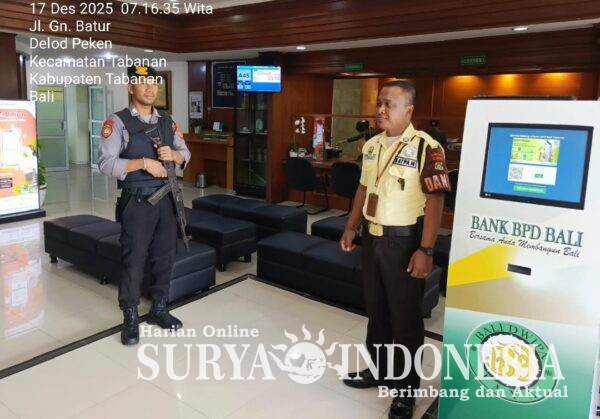 Tabanan, Surya Indonesia.net – Sebagai bentuk pelayanan prima Polri kepada masyarakat, Unit PAM OBVIT Sat Samapta Polres Tabanan melaksanakan kegiatan pengamanan dan pengawalan obyek vital pada Rabu, 17 Desember 2025. Kegiatan berlangsung mulai pukul 08.00 Wita hingga 15.00 Wita, dengan mengedepankan motto “Samapta Siap Siaga dan Terlihat” guna memberikan rasa aman dan nyaman bagi masyarakat yang beraktivitas di jam kerja.