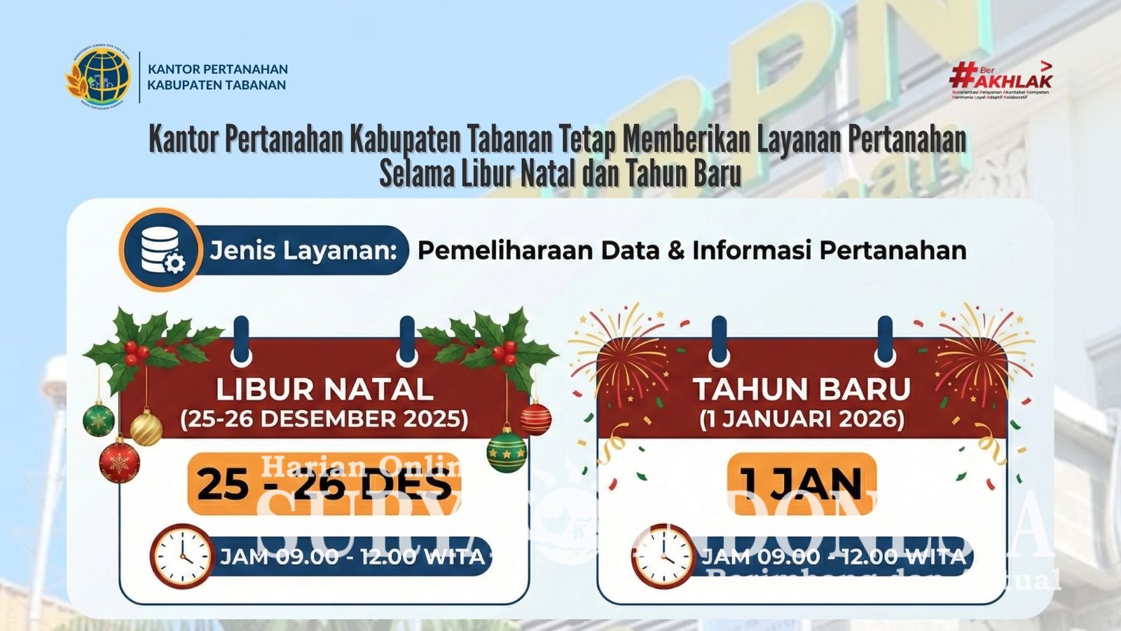 Tabanan, Surya Indonesia.net – 18 Desember 2025 — Kantor Pertanahan Kabupaten Tabanan akan tetap memberikan layanan pertanahan selama libur Hari Raya Natal Tahun 2025 dan Tahun Baru 2026. Hal ini mengikuti arahan dari Kementerian Agraria dan Tata Ruang/Badan Pertanahan Nasional melalui Surat Edaran Nomor 14/SE-TU.03/XII/2025.