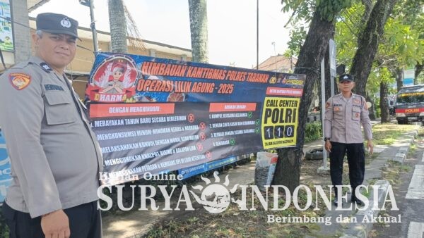 Tabanan, Surya Indonesia.net – Menjelang perayaan Hari Raya Natal dan Tahun Baru 2025, Satgas Preemtif Ops Lilin Agung 2025 Sat Binmas Polres Tabanan melaksanakan kegiatan pemasangan spanduk kamtibmas di sejumlah persimpangan strategis di wilayah Tabanan. Kegiatan ini bertujuan untuk meningkatkan kesadaran masyarakat serta menciptakan situasi keamanan dan ketertiban yang aman dan kondusif menjelang akhir tahun.