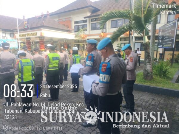 Tabanan, Surya Indonesia.net – Sipropam Polres Tabanan melaksanakan kegiatan pengamanan dan pengawasan (pam/was) terhadap personel yang mengikuti Apel Operasi Lilin Agung 2025. Kegiatan tersebut berlangsung pada Rabu, 24 Desember 2025, pukul 08.30 WITA, bertempat di Lapangan Apel Tathya Dharaka Polres Tabanan. Pam/was dipimpin langsung oleh Kasipropam Polres Tabanan, AKP I Ketut Manis, S.H., sebagai bentuk pengawasan internal guna memastikan kesiapan dan kedisiplinan personel.