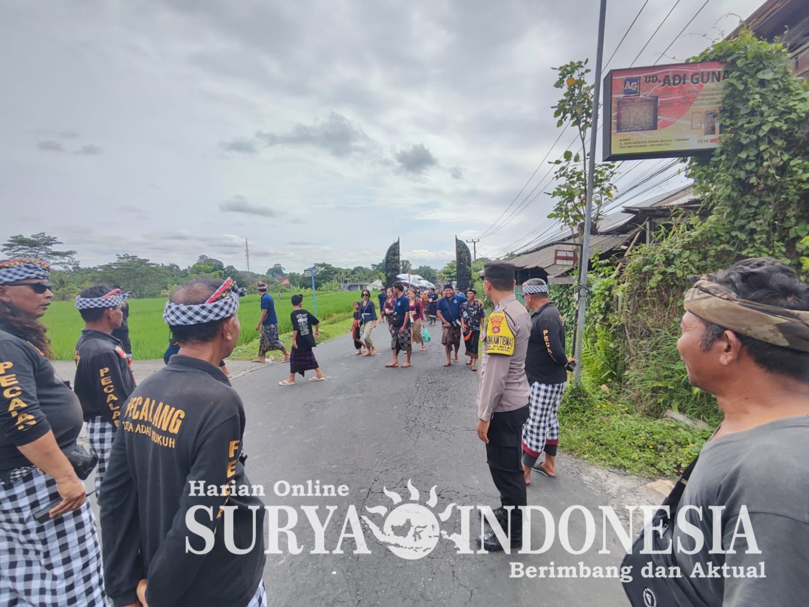 Bhabinkamtibmas desa kukuh bersama pecalang desa adat kukuh melaksanakan pengamanan dan pengaturan arus lalin dalam rangka mendak nama dan ngeplugin rangkaian upacara pitra yadnya massal banjar adat denuma, ds kukuh, kec marga, Jumat,(26/12/25), pukul 08.30 wita.