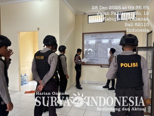 Tabanan, Surya Indonesia.net – Sebagai upaya memastikan keamanan serta kesiapsiagaan petugas jaga, Ps Kasubnit 2 Dalmas Polres Tabanan BRIPKA I Wayan Rangga Dita Diputra melaksanakan kegiatan pengecekan ruang tahanan dan kontrol petugas jaga di Rutan Mako Polres Tabanan pada Minggu, 28 Desember 2025, sekitar pukul 09.50 Wita.