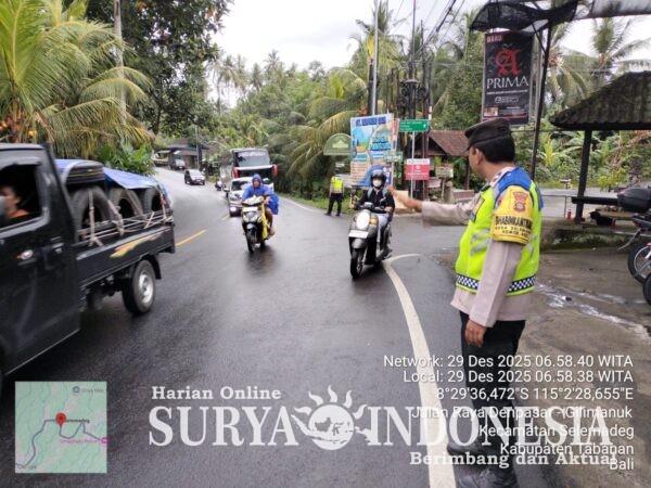 Tabanan, Surya Indonesia.net – Personel Polsek Selemadeg, Aiptu I Wayan Mudastra, Aiptu I Wayan Ardika dan Aipda I Komang Anom Ariasa Argapa, melaksanakan strong point di Simpang Selemadeg dan Simpang Babakan pada Senin pagi (29/12). Giat pukul 06.30–08.00 Wita ini difokuskan pada pengamanan penyeberang jalan dan pengaturan arus kendaraan di jalur utama.