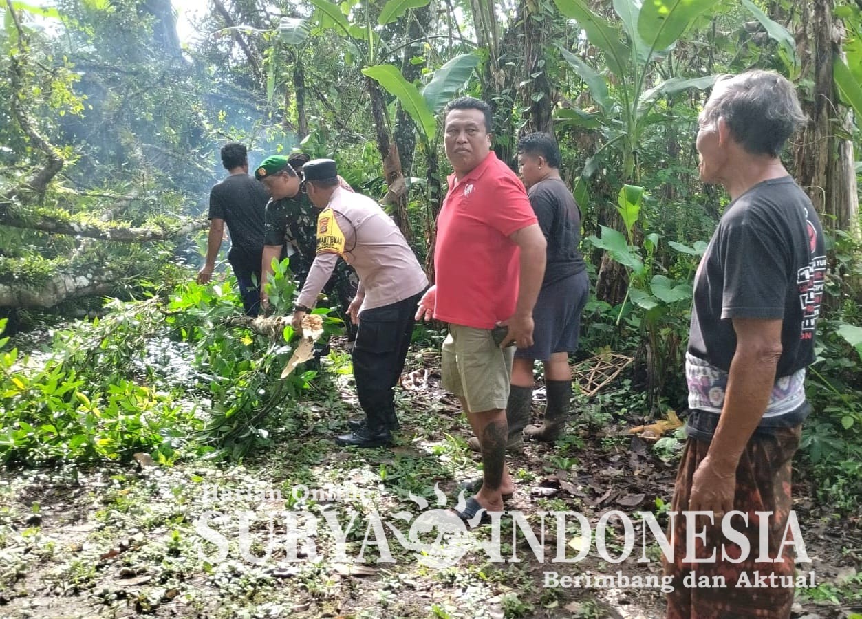 BALI – Badung,Surya Indonesia. Net – Kejadian pohon tumbang kembali terjadi, kali ini di Pura Dalem Alit Banjar Gunung, Desa Taman, Kecamatan Abiansemal, Kabupaten Badung. Kejadian ini disebabkan oleh curah hujan yang cukup tinggi yang disertai angin kencang baru-baru ini. Setelah menerima laporan dari warga tentang kejadian tersebut, Babinsa Desa Taman, Serka I Nyoman Subrata, dengan sigap bersama warga segera turun langsung membantu mengatasi masalah menggunakan alat pemotong pohon serta mengangkut ranting yang patah. Pada Minggu, (28/12/2025).