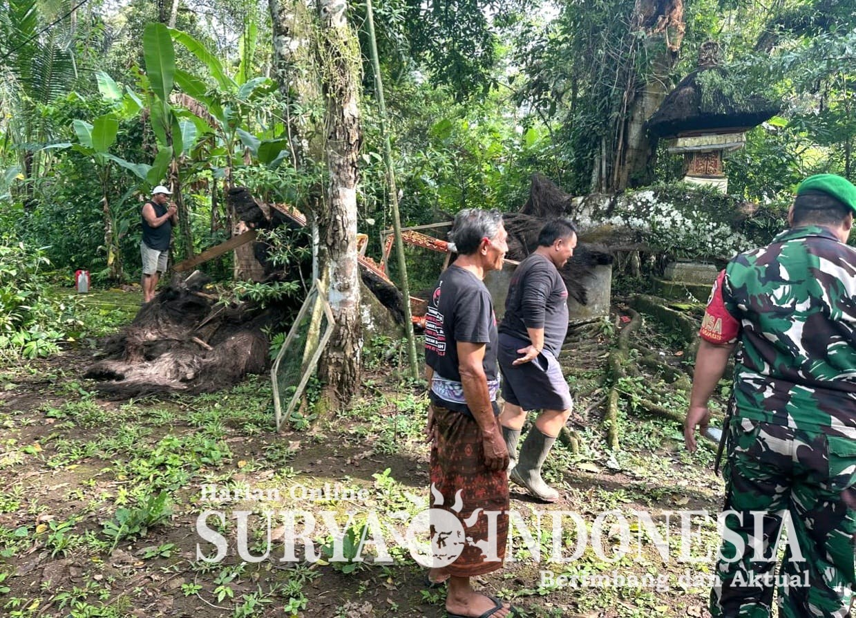 BALI – Badung, Surya Indonesia.net – Kejadian pohon tumbang kembali terjadi, kali ini di Pura Dalem Alit Banjar Gunung, Desa Taman, Kecamatan Abiansemal, Kabupaten Badung. Kejadian ini disebabkan oleh curah hujan yang cukup tinggi yang disertai angin kencang baru-baru ini. Setelah menerima laporan dari warga tentang kejadian tersebut, Babinsa Desa Taman, Serka I Nyoman Subrata, dengan sigap bersama warga segera turun langsung membantu mengatasi masalah menggunakan alat pemotong pohon serta mengangkut ranting yang patah. Pada Minggu, (28/12/2025).