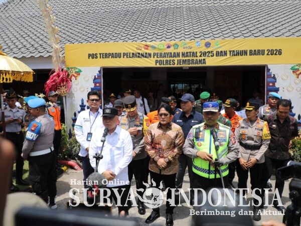 Jembrana, Surya Indonesia.net – Kapolda Bali, Irjen Pol. Daniel Adityajaya, S.H., S.I.K., M.Si. mendampingi Menteri Perhubungan RI, Dudy Purwagandhi dan Kakorlantas Polri, Irjen Pol. Agus Suryonugroho meninjau pengamanan angkutan Natal 2025 dan Tahun Baru 2026 di Pelabuhan Gilimanuk, Jembrana, Senin (29/12/2025).