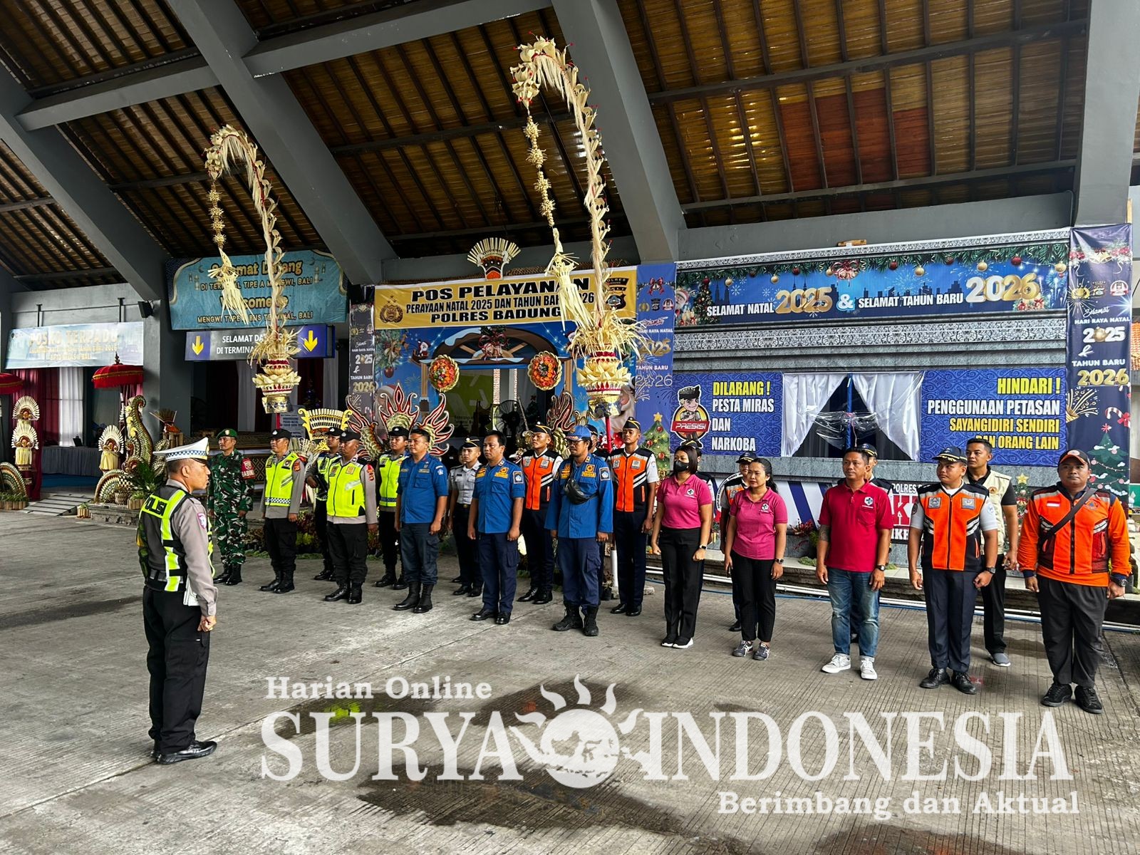 BALI – Badung,Surya Indonesia. Net – Dalam rangka menyambut hari raya Natal dan tahun baru 2026, dilakukan kegiatan apel pengamanan Nataru Tahun 2025 di Terminal Tipe A Mengwi. Kegiatan ini berlangsung pada hari Kamis tanggal 01 Januari 2026 pukul 08.00 WITA, dengan bertempat di halaman Terminal Tipe A Mengwi. Apel dan pengarahan pengamanan dipimpin langsung oleh Ipda Komang Subanda selaku Kepala Pos Pelayanan (Kaposyan).