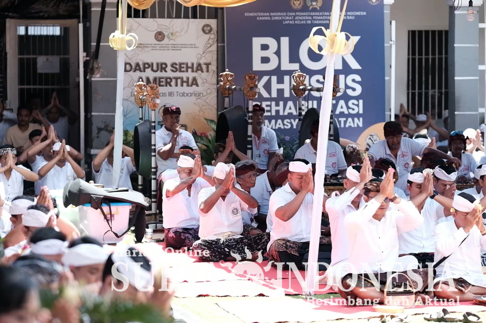 Tabanan, Surya Indonesia. Net – Suasana khidmat menyelimuti Pura Swagina Lembaga Pemasyarakatan (Lapas) Kelas IIB Tabanan saat petugas, anggota Dharma Wanita dan Warga Binaan umat Hindu melaksanakan Upacara Piodalan Pura Swagina, Sabtu (03/01). Upacara keagamaan ini menjadi momentum penting untuk memperkuat nilai-nilai spiritual serta meningkatkan ketenangan lahir dan batin bagi seluruh umat yang mengikuti persembahyangan.