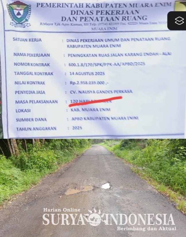 Muara Enim -Senin(05/01/2026)-Pengaspalan jalan penghubung antara Desa Pedataran, Kecamatan Gelumbang, dan Desa Alai, Kecamatan Lembak, Kabupaten Muara Enim, menuai sorotan warga. Proyek yang memiliki pagu anggaran dari APBD 2025 sebesar Rp2.953.039.000 dan dilaksanakan oleh CV Nausya Gandes Perkasa ini diduga memiliki kualitas yang buruk.