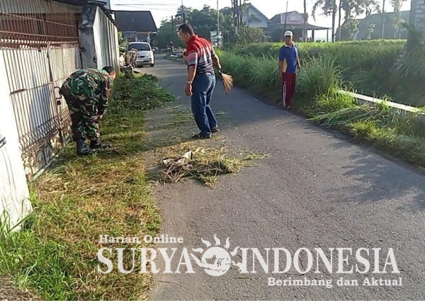 Terlihat Sertu Slamet terjun langsung ke lapangan bersama puluhan warga setempat untuk membersihkan bahu jalan dari rumput liar, sampah plastik, serta merapikan saluran air yang tersumbat.