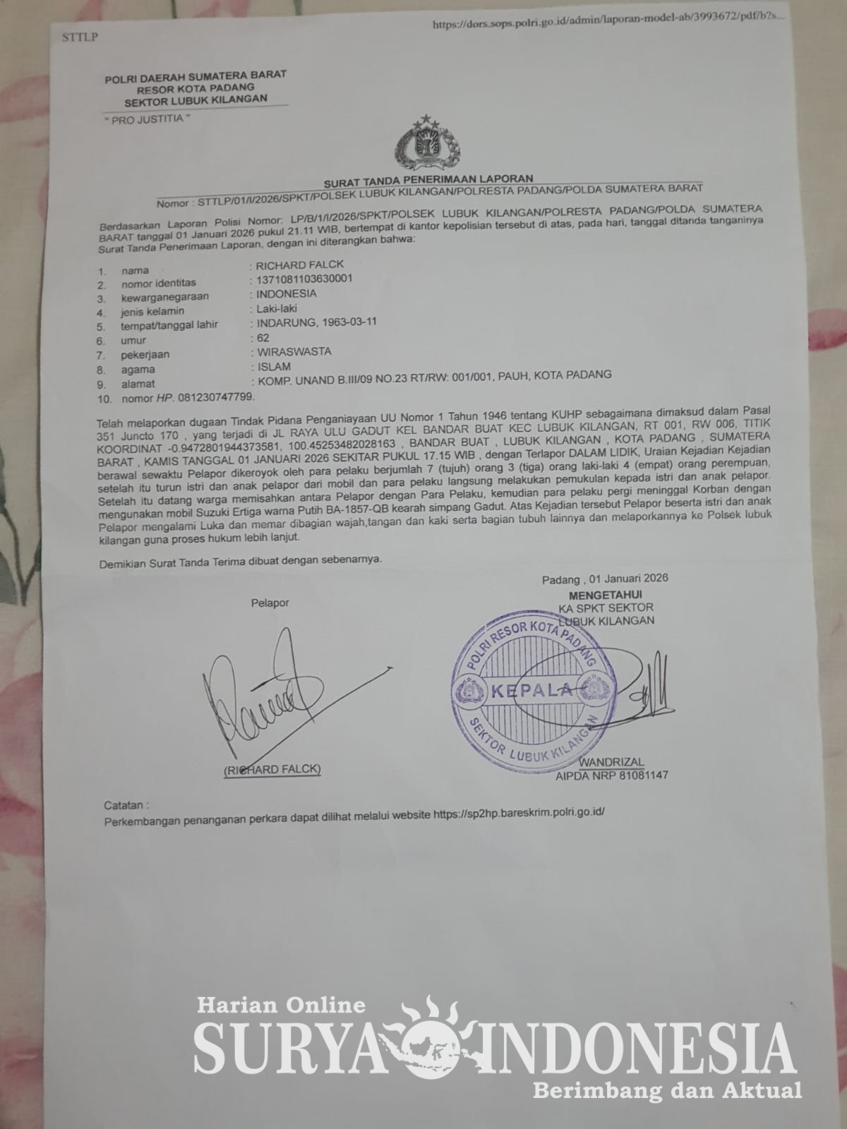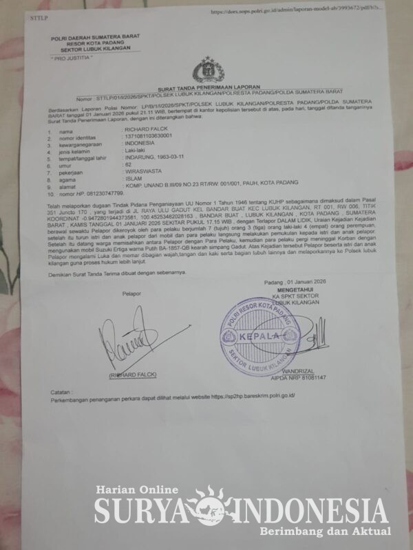 PADANG | SURYA INDONESIA || – Peristiwa dugaan tindak pidana penganiayaan yang dialami oleh Richard Falck, dilaporkan ke Polsek Lubuk Kilangan, pada Kamis (1/1/2026).