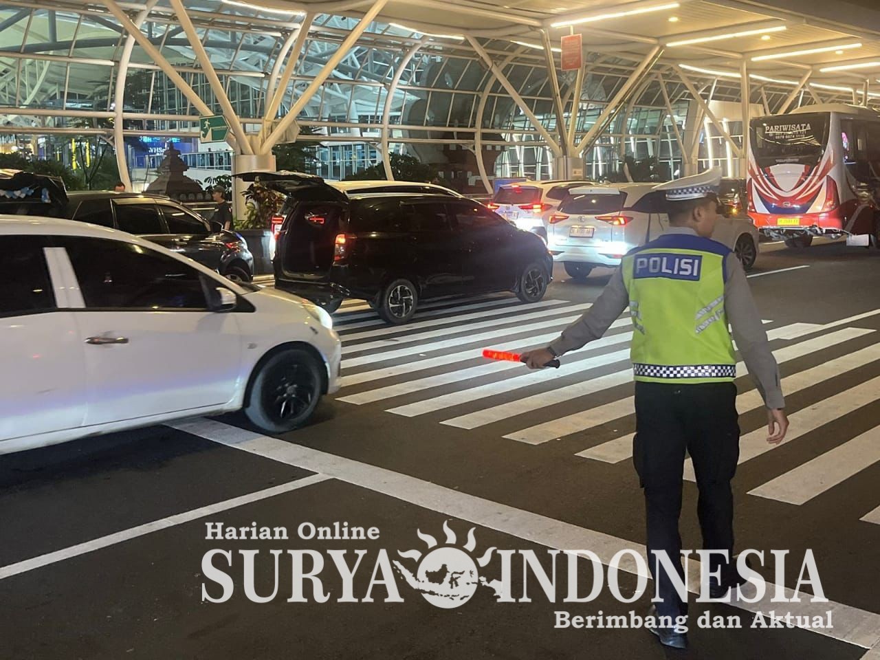 Badung , Surya Indonesia.net – Personel Polres Kawasan Bandara I Gusti Ngurah Rai melaksanakan pengaturan arus lalu lintas di area drop zone Terminal Internasional pada Kamis malam (8/1/2026). Pengaturan dilakukan untuk memastikan kelancaran proses penurunan penumpang di tengah meningkatnya aktivitas kendaraan pada jam-jam sibuk kedatangan penerbangan internasional.
