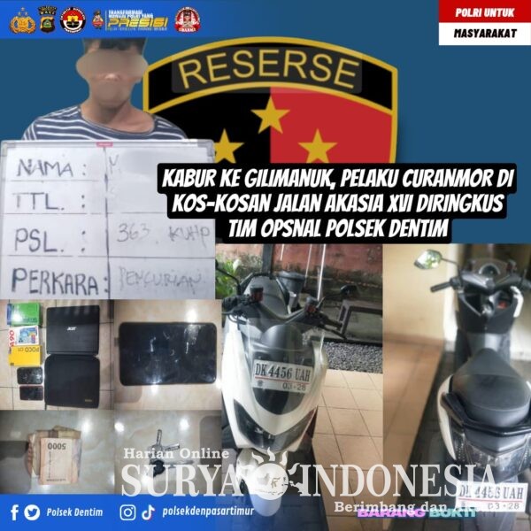 Denpasar,Surya Indonesia.net – Polsek Denpasar Timur (Dentim) berhasil mengungkap kasus tindak pidana pencurian kendaraan bermotor (curanmor) yang terjadi di sebuah rumah kos di Jl. Akasia XVI Gang Pisang No. 10, Kelurahan Kesiman, Denpasar Timur. Pelaku berinisial MRH (21th) berhasil diamankan oleh Tim Opsnal Polsek Dentim saat melarikan diri ke wilayah Gilimanuk, Kabupaten Jembrana.