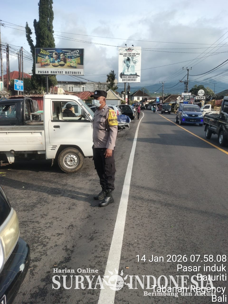 Tabanan, Surya Indonesia.net – Polsek Baturiti melaksanakan kegiatan strong point pagi pada Rabu, 14 Januari 2026 mulai pukul 06.30 hingga 09.30 Wita yang berlokasi di depan Pasar Baturiti. Kegiatan ini dilaksanakan oleh Aiptu I Wayan Dirgayusa dan Aiptu I Putu Gede Widama dalam rangka menjaga kelancaran arus lalu lintas serta memberikan rasa aman bagi masyarakat yang beraktivitas di sekitar pasar.