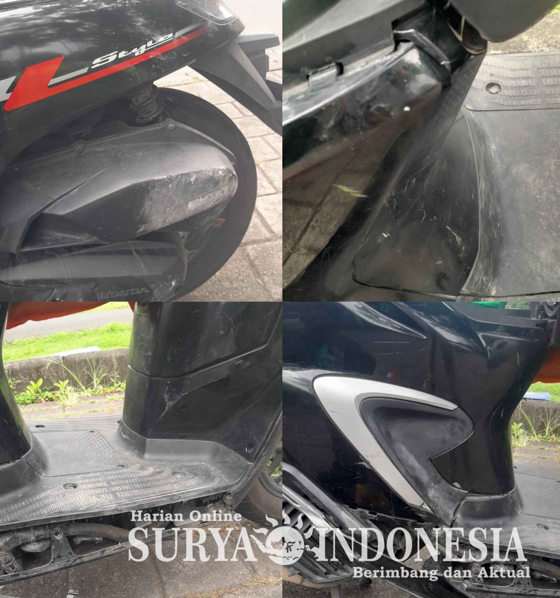 Hingga saat ini, korban belum mengetahui secara pasti apakah sepeda motornya rusak akibat terjatuh sendiri atau ditabrak oleh pengendara lain saat terparkir.
