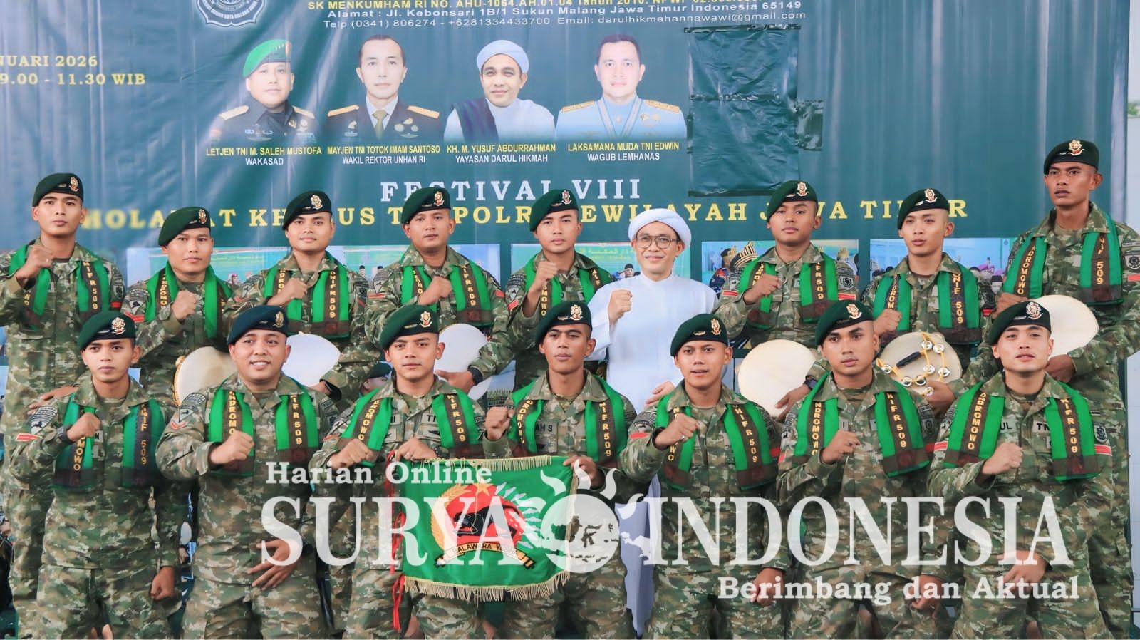 Malang, suryaindonesia.net,- Prestasi membanggakan kembali ditorehkan oleh Group Sholawat Yonif 509. Dalam ajang Festival Sholawat ke-8 yang digelar oleh Yayasan Darul Hikmah An-Nawawi pada Minggu, 18 Januari 2026, Group Sholawat Yonif 509 berhasil meraih Juara II dalam kompetisi tingkat TNI–POLRI se-Jawa Timur.