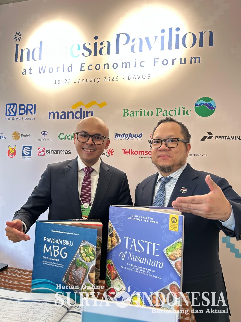 “Saya menyerahkan buku Rasa Bhayangkara Nusantara versi Bahasa Inggris kepada Bapak Stefanus Ade Hadiwidjaja, Managing Director, Investment, Danantara Indonesia, untuk ditampilkan di Paviliun Indonesia pada WEF Davos 2026 sebagai bagian dari showcase diplomasi MBG dan khazanah rasa Nusantara,” ujar Dirgayuza Setiawan.